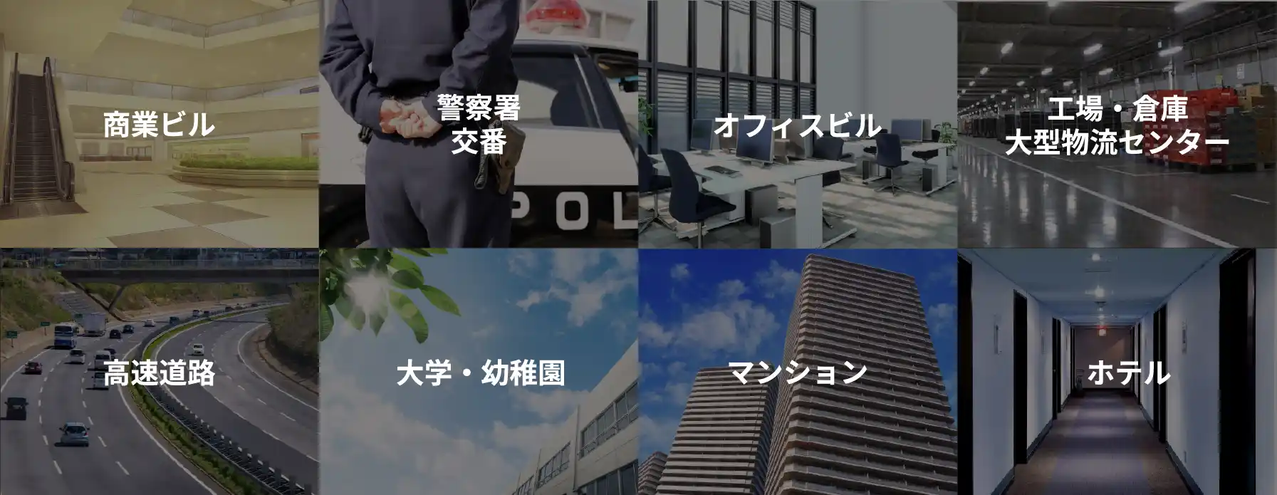 | ◆ 税務署、法務局、警察署、交番、高速道路、銀行、街頭防犯、海岸監視、大学、高校、中学校、小学校、幼稚園、保育園 |