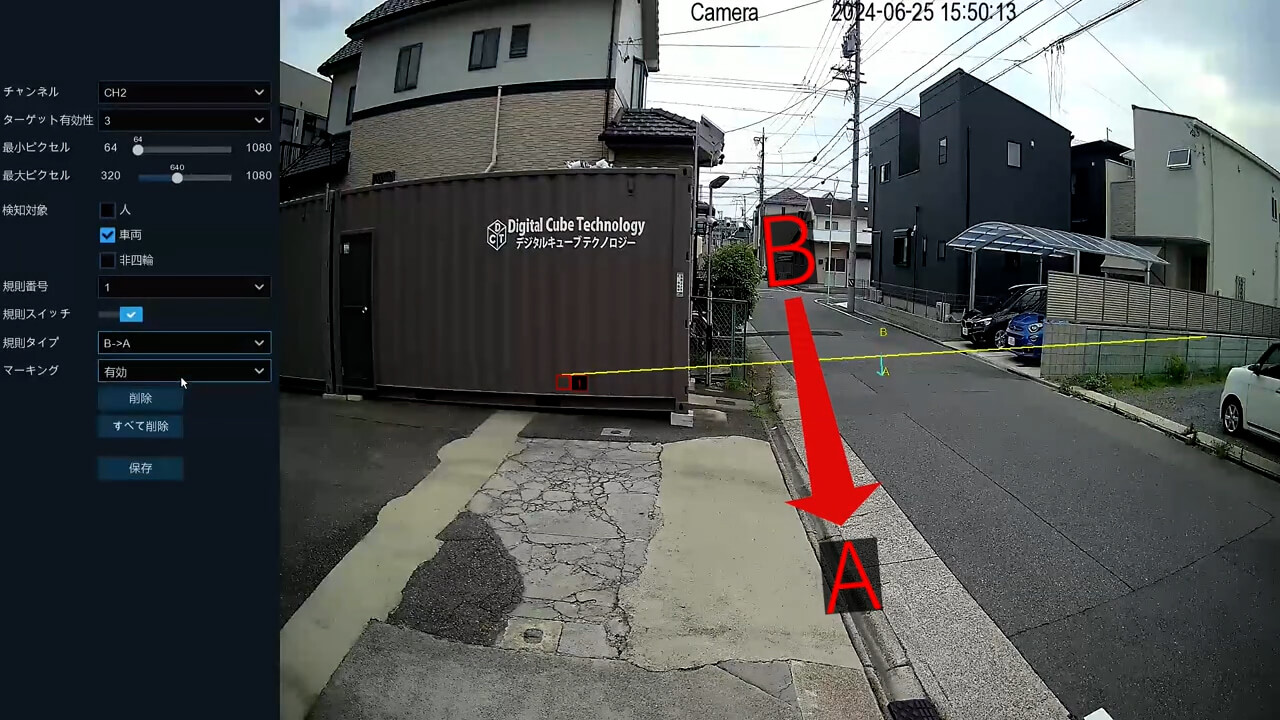 - 方向指定検知: 画面上にラインを設定し、「AからBへ」など指定した方向以外の動きを検知。