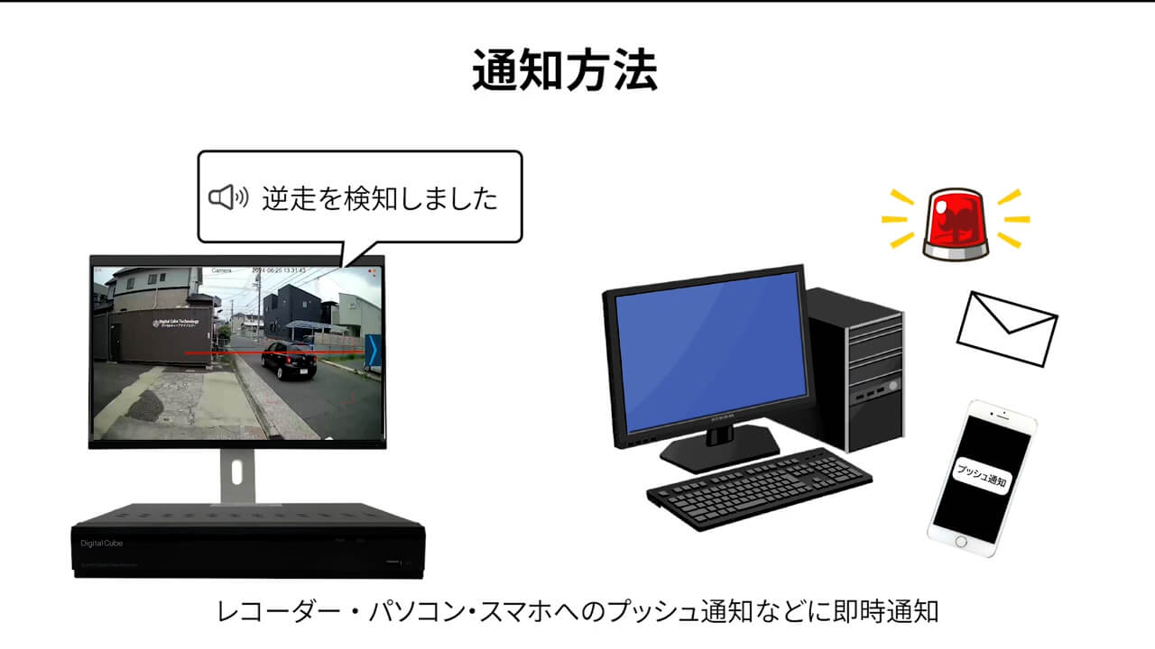 - リアルタイムアラート: 逆走が発生した瞬間に、回転灯やスマホ、PCへプッシュ通知を行います。