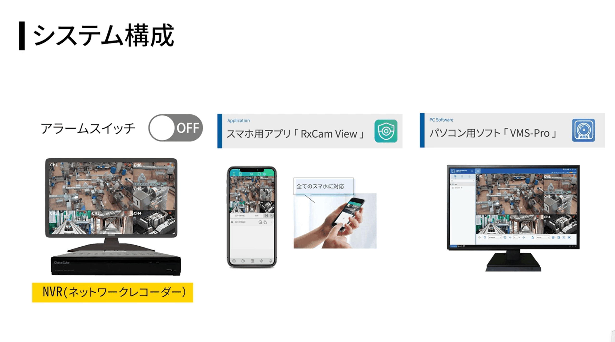 館内放送システムは、ネットワークカメラ、スピーカー、そしてNVR(ネットワークビデオレコーダー)を組み合わせたものです。システム構成や活用例を動画で詳しく解説しています。ぜひご覧ください。