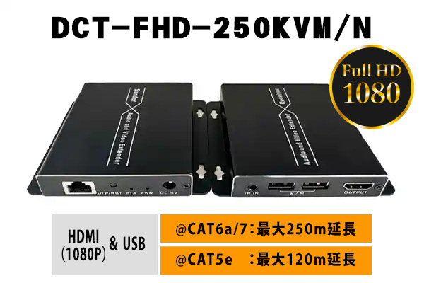 DCT-FHD-250KVM/Nは、HDMIの映像(フルHD)とUSBの通信を最大250mまで配線できるHDMIエクステンダーです。