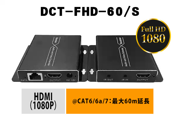 DCT-FHD-60/Sは、HDMIの映像(フルDH)を最大60mまで延長できるHDMIエクステンダーです。Cat6/6A/7ケーブル対応した高い互換性に加え、PoC給電ができるので、受信側での電源が必要ありません。