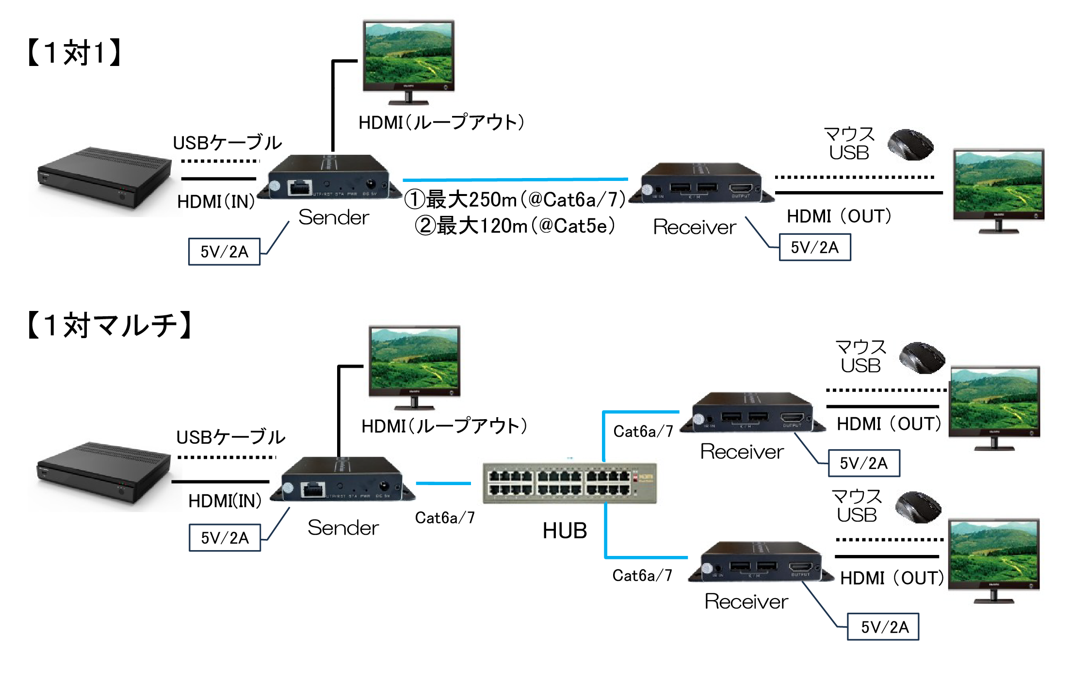 ■ HDMIとUSBを1対1で延長、またはHUBを経由し1対マルチで延長も可能