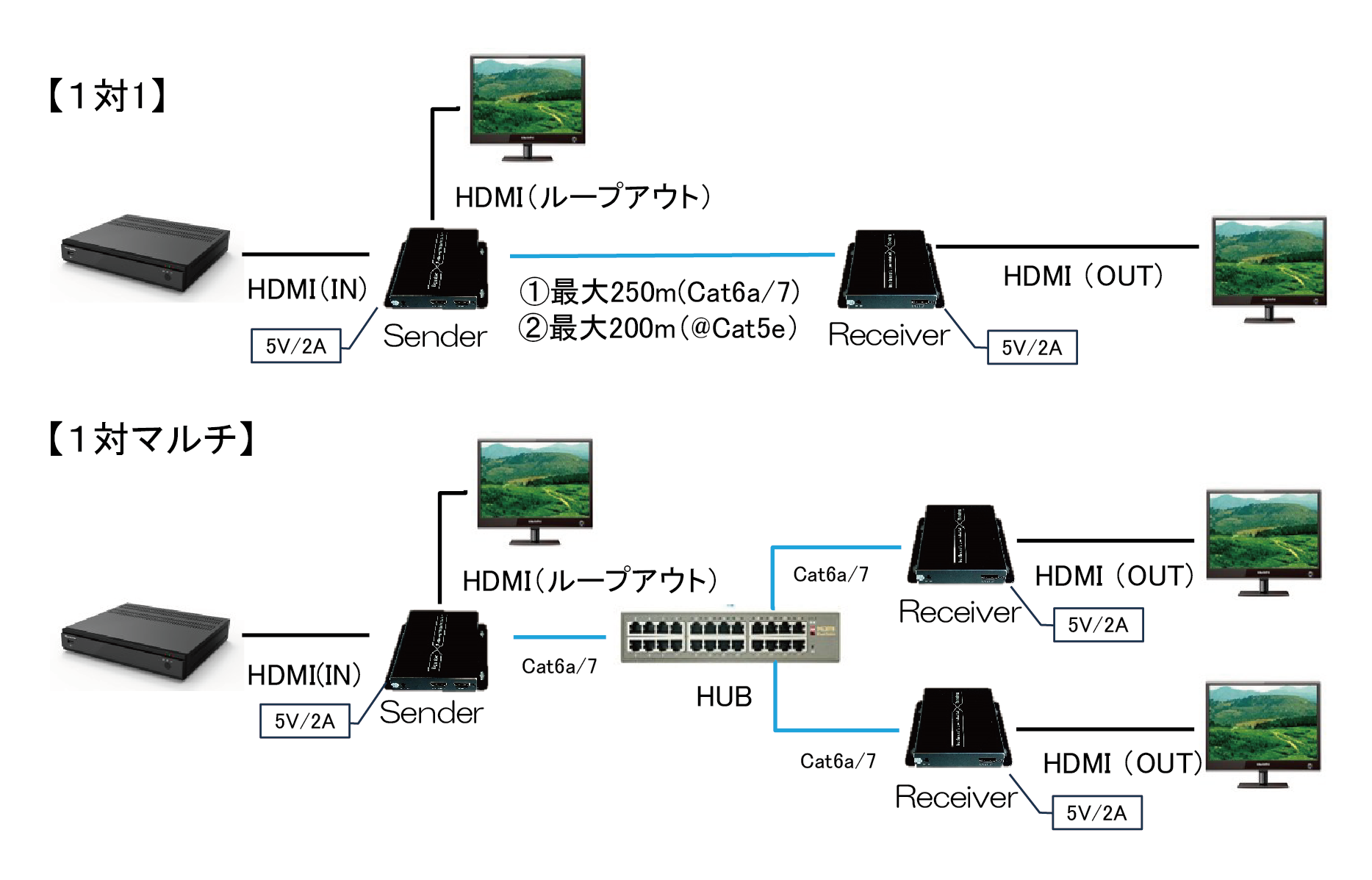 ■ HDMIを1対1で延長、またはHUBを経由し1対マルチで延長も可能