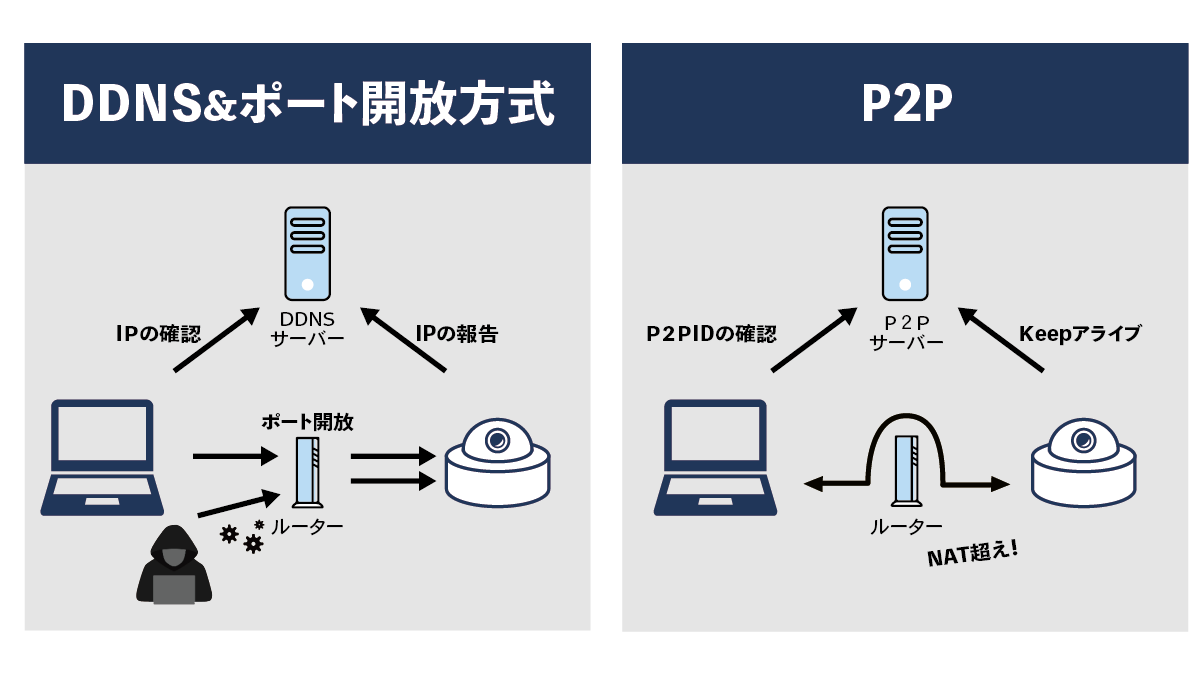 - ①侵入経路を作らない(DDNS方式&ポート開放方式からP2P接続方式へ)