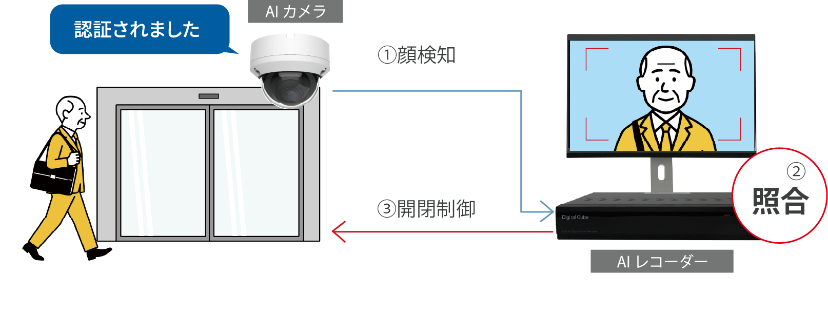 AIカメラが人物を検知するとAIレコーダーにあるデータベースと照合し、入場を許可された従業員だけドアが開きます。