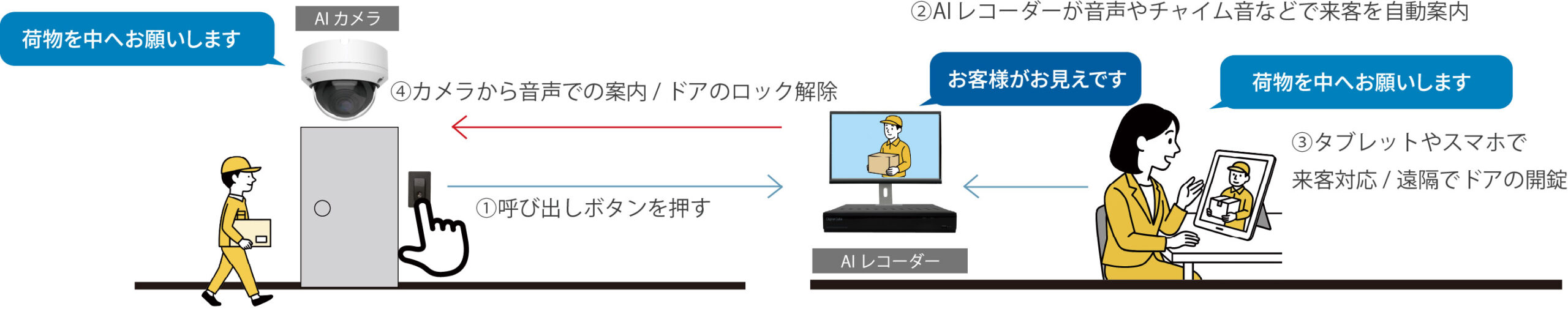 出入口の呼び出しボタンを押すと、オフィスにあるAIレコーダーが自動で来客をお知らせ。タブレットやスマホから映像確認・音声対応・遠隔でのドア解錠が行えます。