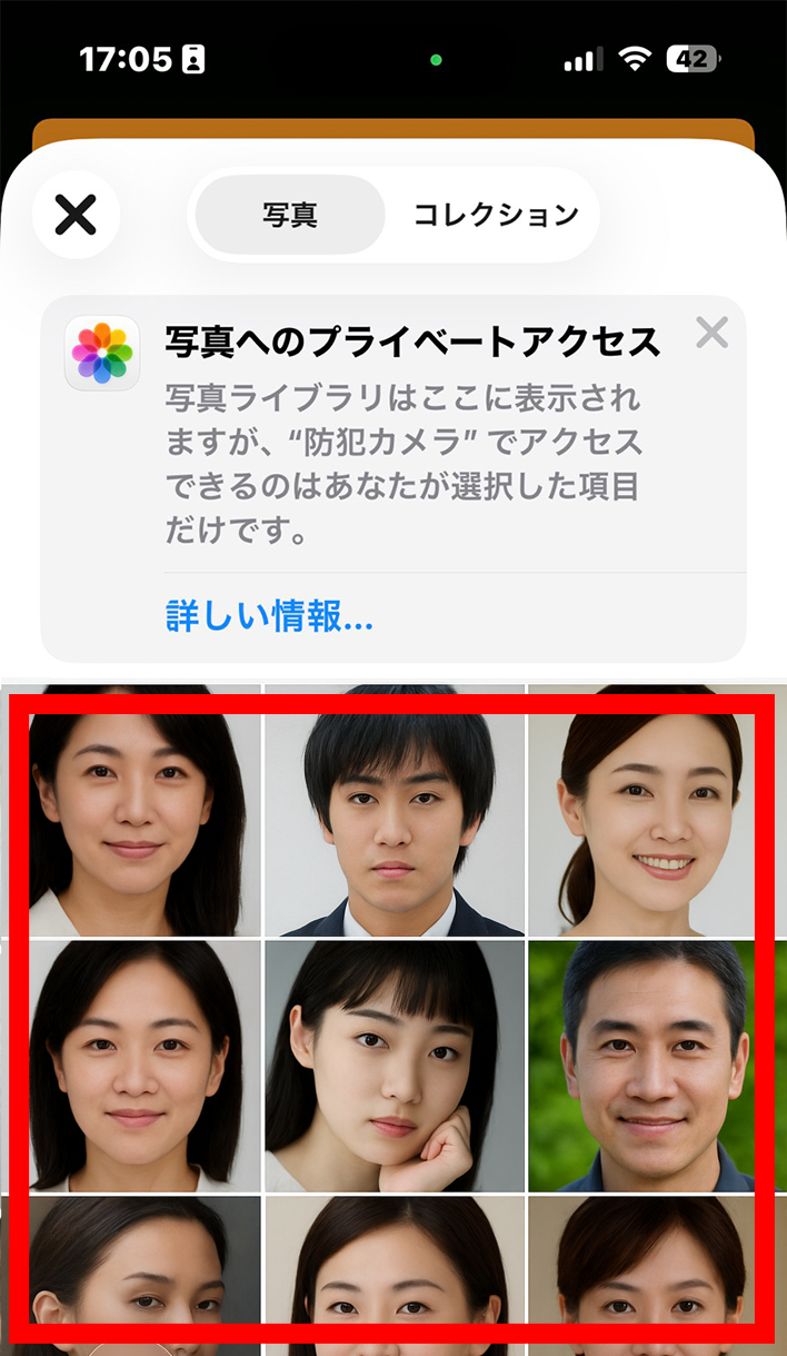 ②防犯カメラのアプリの顔登録メニューからスマホで撮影した顔画像を呼び出し選択します。